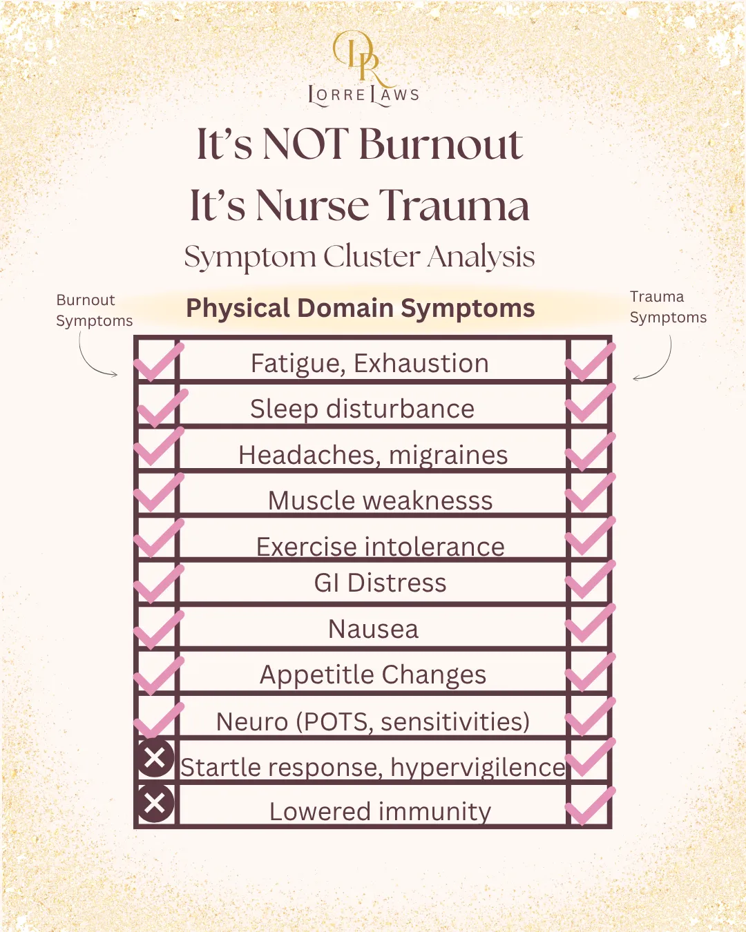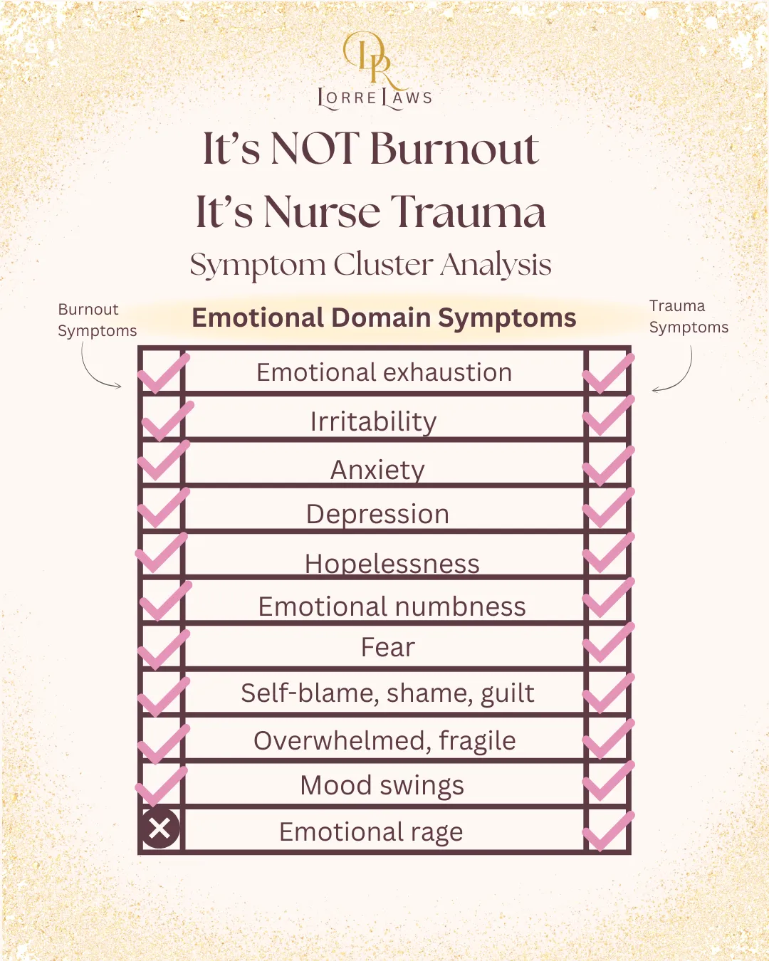 Nurse-specific traumatization is often misattributed to burnout. If you're experiencing one or more of these symptoms that is not being relieved by traditional self-care practices, you may be experiencing nurse-specific traumatization.